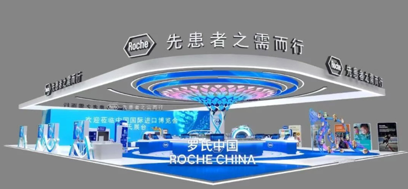 沉浸式交互展臺如羅氏。羅氏以"引領創新,守護生命"為主題,通過"生命穹頂"的藝術呈現,沉浸式展示醫療創新與人文關懷的深度交融,詮釋羅氏堅持創新、守護生命的初心和使命。